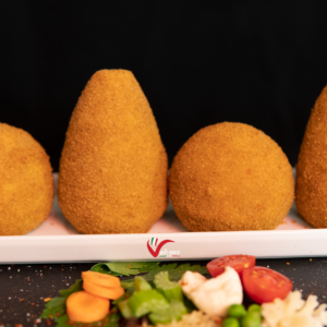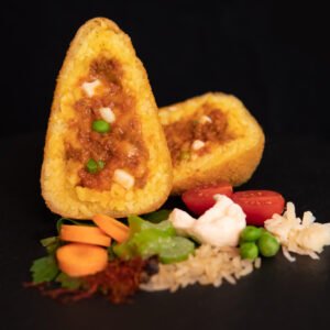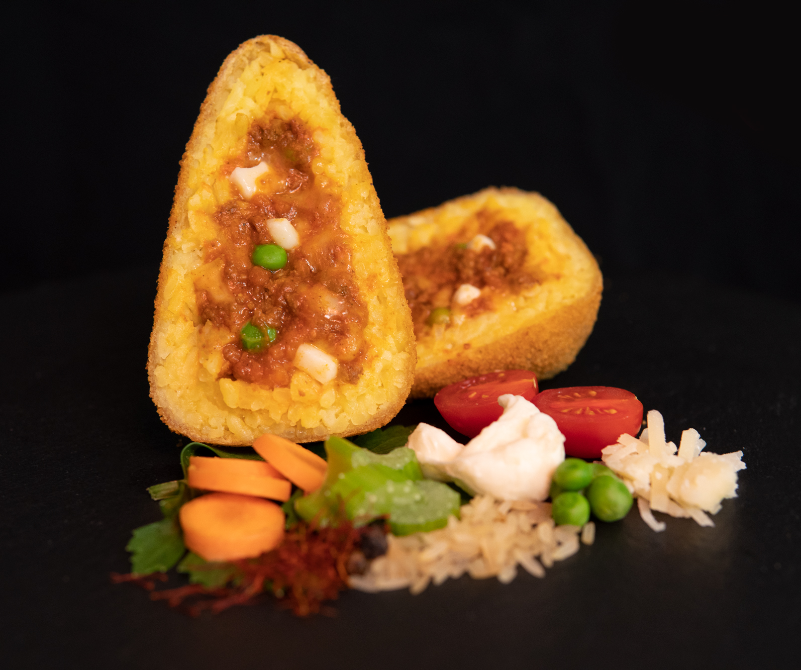 Die safrangelben Reispyramiden sind mit einer Bolognese Füllung gefüllt. Die traditionelle Bolognesesauce besteht aus reinem Rinderhackfleisch mit verschiedenen Gemüsesorten, die am Ende mit Erbsen und Mozzarella abgerundet werden. Alles badet in einer saftigen Tomatensauce. Der Reis, der als Hülle dient, wird letztendlich von einer knusprigen Panade umhüllt, welche im heißen Öl gebacken wurde. Beim ersten Biss genießt man den mit Gewürzen angereicherten Reis. Beim zweiten Biss vereinen sich alle Zutaten zu einem geschmackvollen Erlebnis.